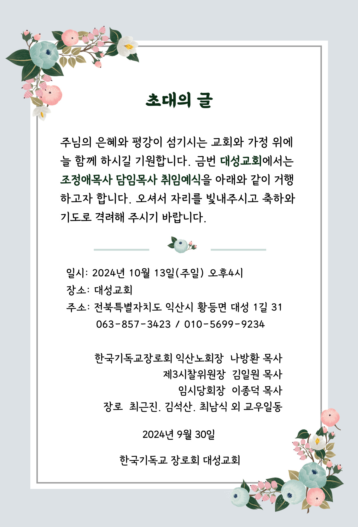 [초대의 글] 대성교회 조정애 담임목사 취임예식 24.10.13